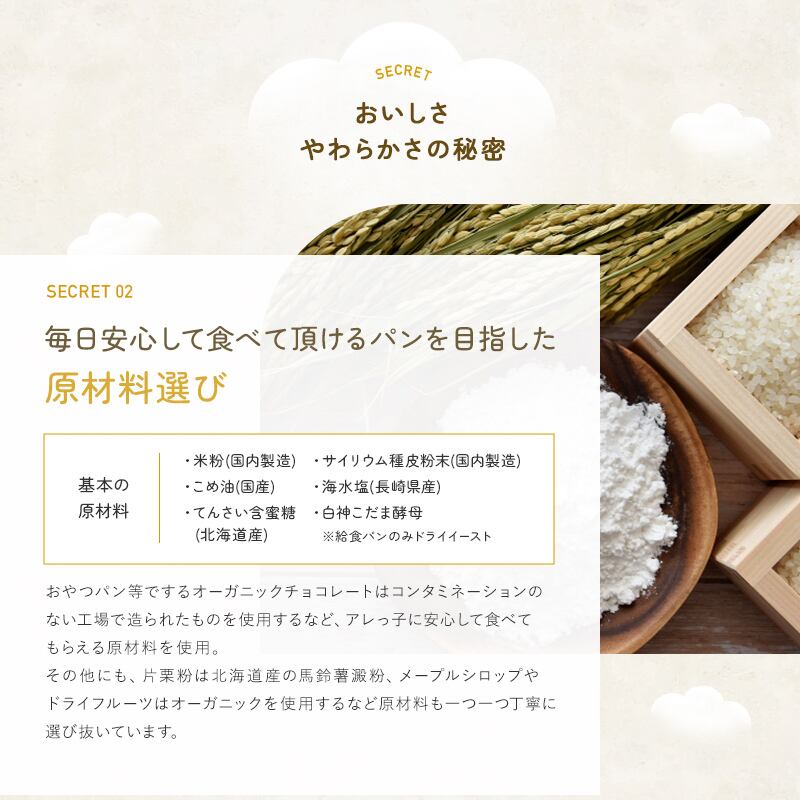毎日の食事やおやつタイムに、アレっ子も安心して楽しめる「ふわこめお任せセット」は、アレルゲン8品目不使用で、グルテンフリーの米粉パン&おやつセットです。
