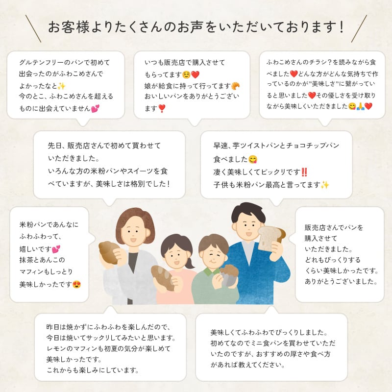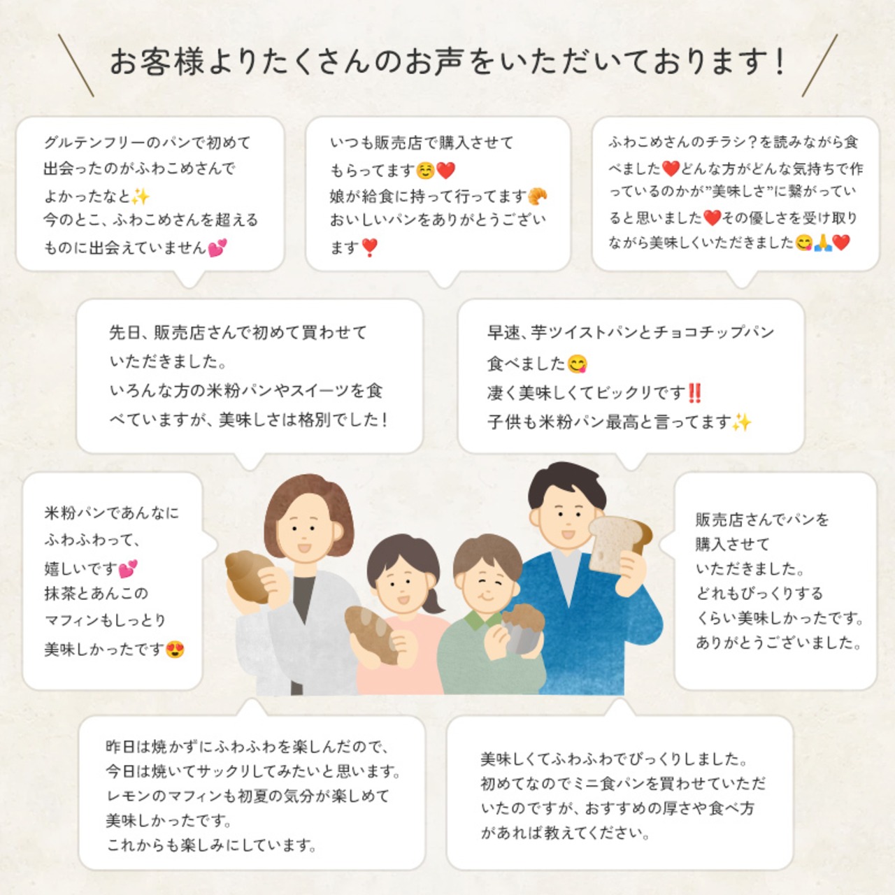 毎日の食事やおやつタイムに、アレルギーっ子も安心して楽しめる「ふわこめお任せセット」は、アレルゲン8品目不使用で、グルテンフリーの米粉パン&おやつセットです。
